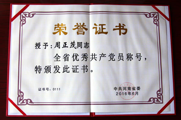 2016年6月,中共河南省委授予三门峡市中级人民法院周正茂同志全省优秀共产党员称号。
