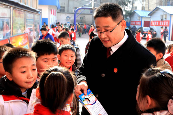 他是爱心志愿者,积极爱心助困、助学,关爱乡村留守儿童,与他们建立一对一手帮扶关系。他关爱孤残儿童,为他们送去轮椅、拐杖、衣物、食品。他积极参与爱心走长城、广场普法、送法进校园等公益活动,每年为辖区10余所中小学及聋哑学校上法制课,20000余名中小学生接受了普法教育,提高学生的自我保护意识,被小朋友称作“法官叔叔”,收到了良好的法律宣传效果,受到党委、政府、学校、家长及社会广泛赞同。