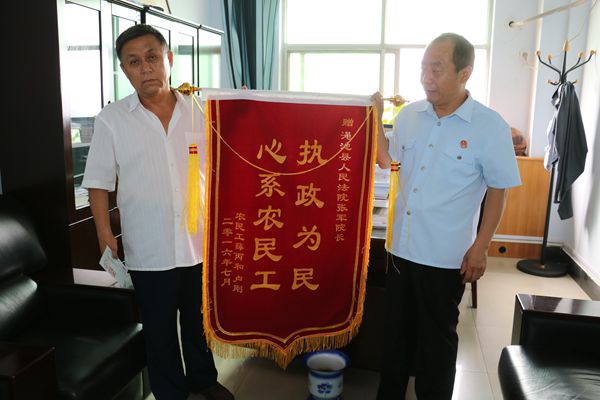“这下好了, 民工兄弟们子女的学费和父母需要看病吃药的钱都有着落了,感谢张军副院长,我们忘不了你的恩情...”。7月6日上午,来自洛阳市孟津县马屯乡东官庄村的当事人薛某某将一面写着“执法为民 心系农民工”的锦旗送到了渑池县法院党组成员、副院长张军手中,表达了他所代表的四十余名农民工兄弟们对法院倾力调解案件、维护农民工合法权益的感激之情。
