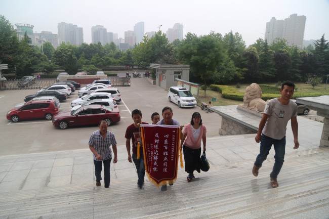 6月23日上午九时,灵宝市五亩乡某村农民工李某带领部分农民工赶到灵宝市人民法院,向该院案件送达组赠送一面写着“心系百姓正司法 及时送达解民忧”字样的锦旗,衷心感谢法院干警为他们讨薪。