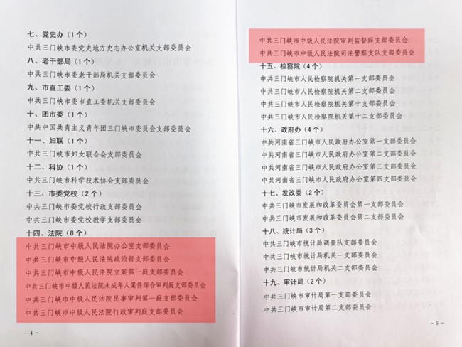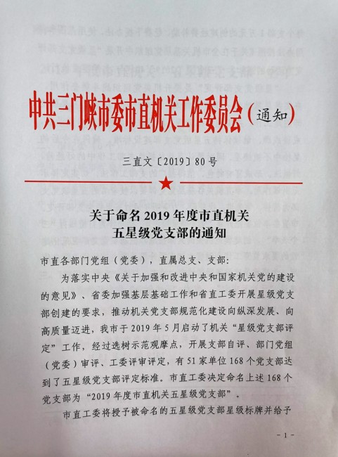 2019年12月,三门峡市中级人民法院第一批8个申报五星级的办公室、政治部、立案一庭、少年庭、民一庭、行政庭、审监庭、法警队党支部被市直工委命名为“2019年度市直机关五星级党支部”,并授予五星级党支部星级标牌。