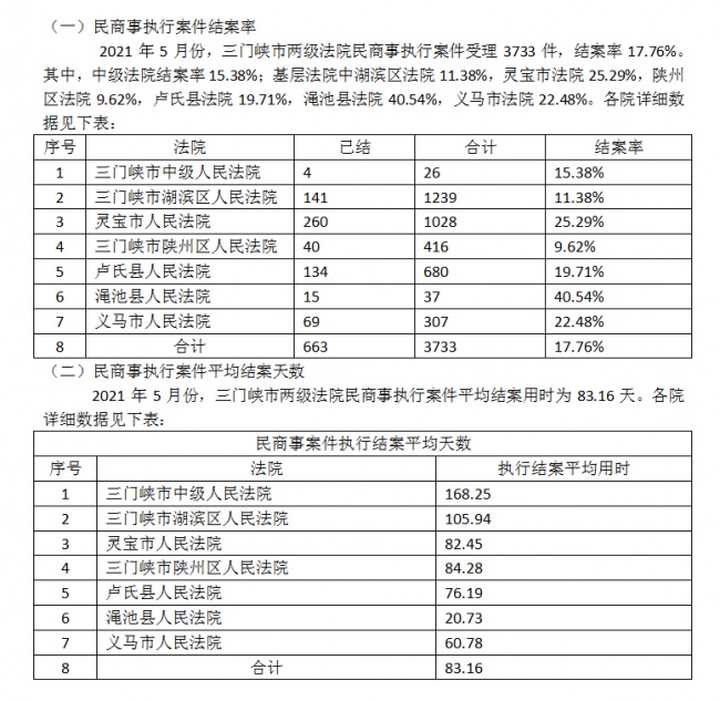 三门峡两级法院民商事执行案件相关数据信息(2021年5月份)